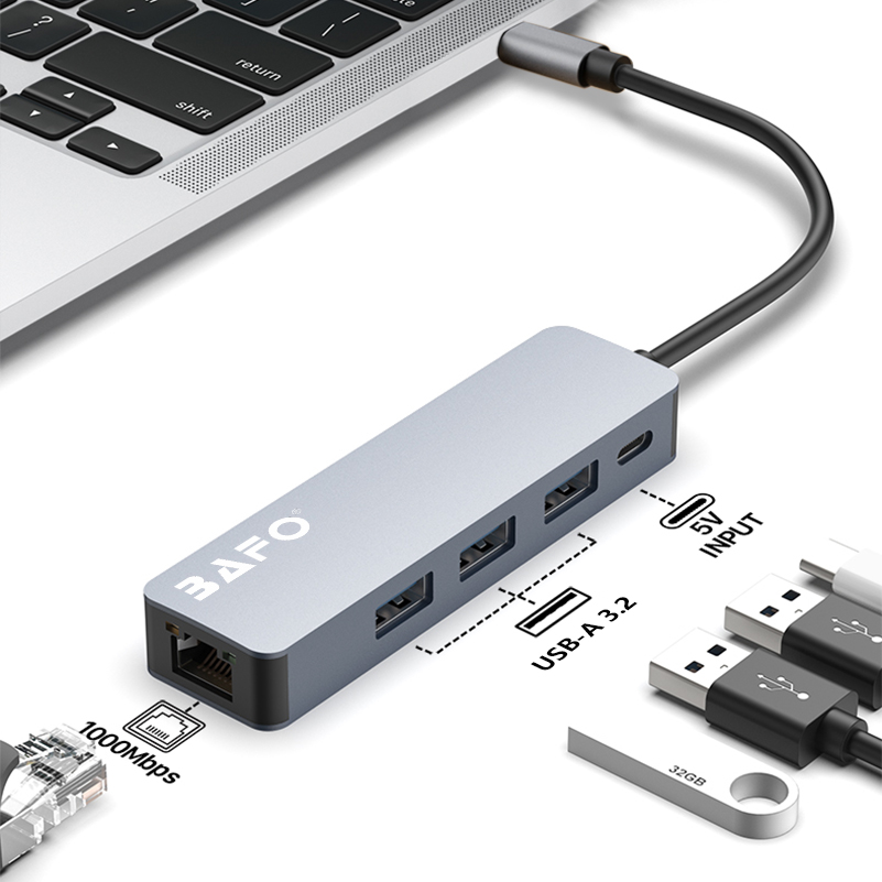 USB-C to 3*USB-A3.2(5Gbps)+RJ45(1000M)+USB-C(DC 5V) Docking Station (5 in 1)